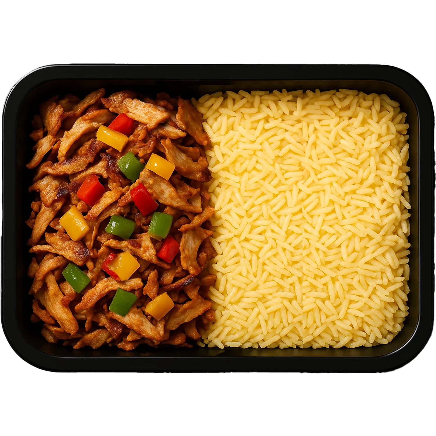 Ingrediënten: Kipdöner (100% halal kipfilet), witte rijst, rode paprika, gele paprika, ui, knoflook, olijfolie, verse kruiden, peper, zout